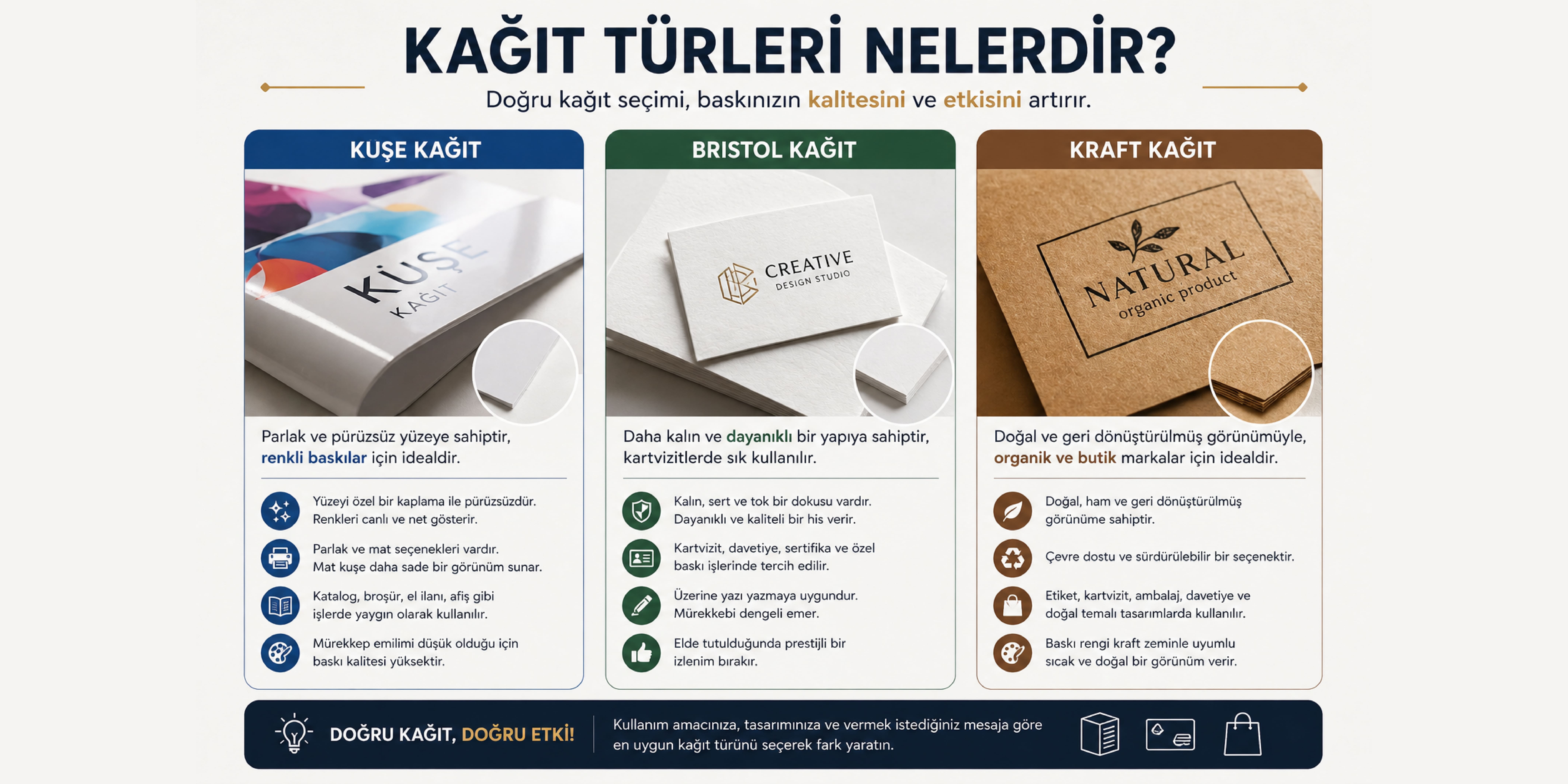 Özetle; kuşe kağıt canlı ve profesyonel görsellik için, bristol dayanıklılık ve prestij için, kraft ise doğal ve butik bir marka hissi yaratmak için tercih edilir. Doğru kağıt seçimi, baskının sadece görünümünü değil, müşteride bıraktığı algıyı da tamamen değiştirebilir.